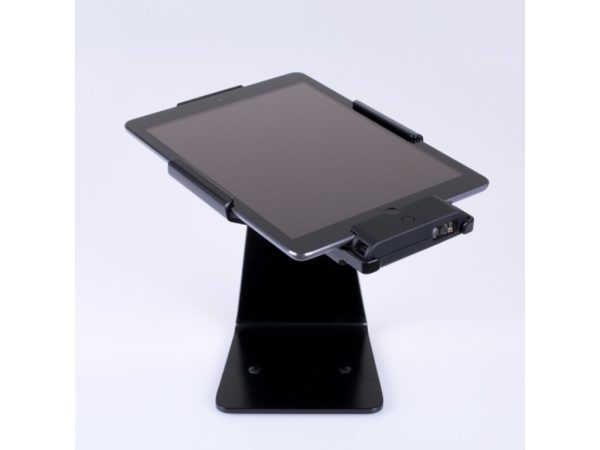 Suport metalic securizat cu cap rotativ, compatibil cu Infinea Tab Mini si iPad Air.